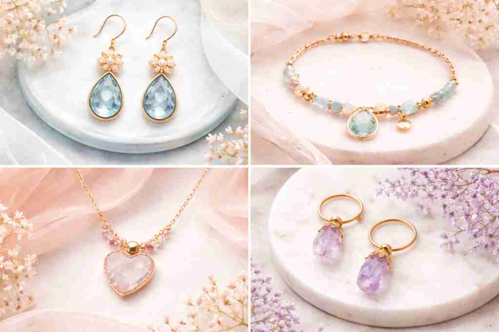 Esta colección de joyería destaca por su estilo romántico y delicado, con una paleta de colores suaves como celeste, rosa y lila, perfecta para un look femenino y elegante.